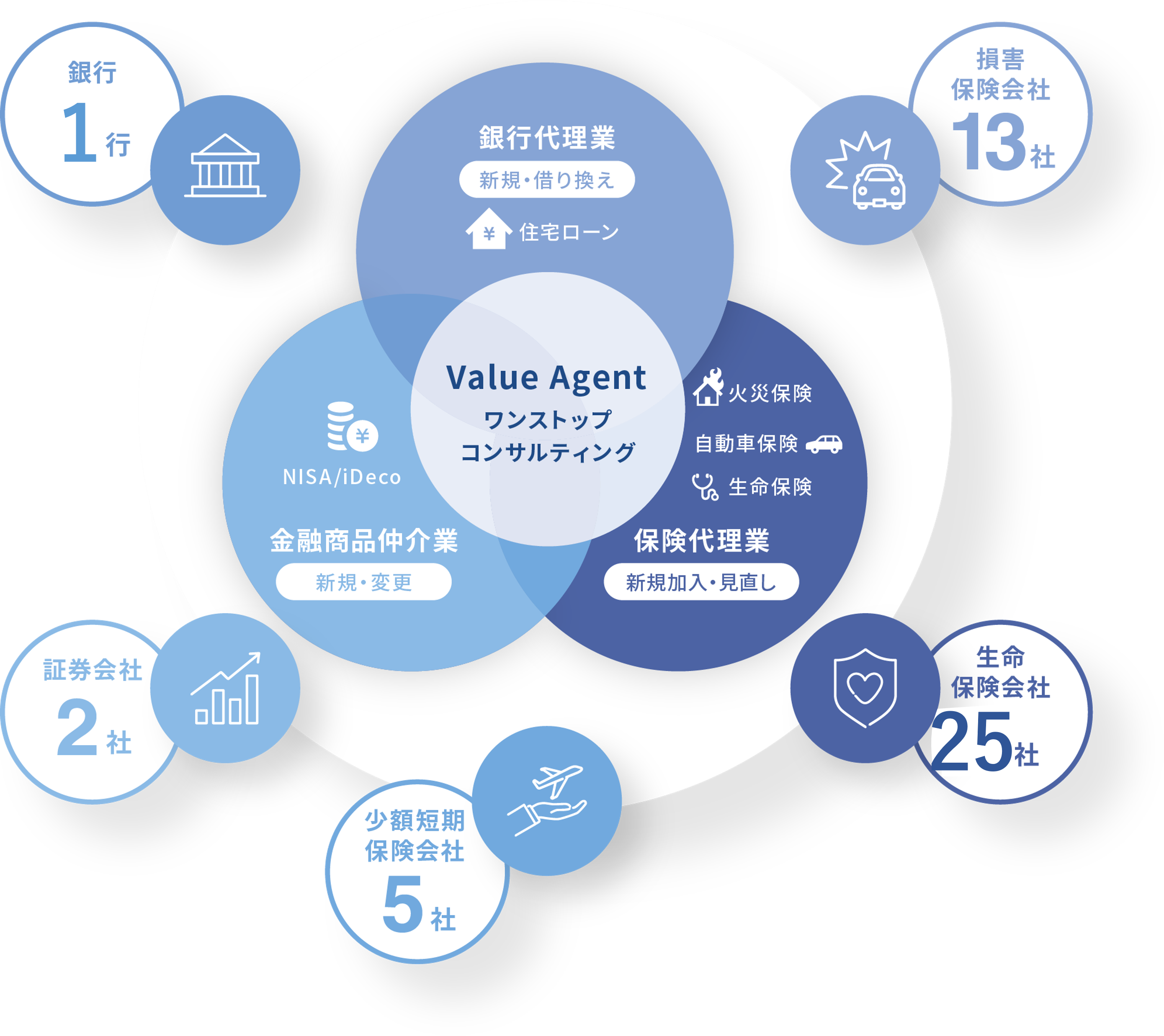 保険・証券・住宅ローンをワンストップで提供できる、全国でも数少ない総合金融代理店。複数の大手金融機関の商品を一括で取り扱えるのは当社ならではの強みです。